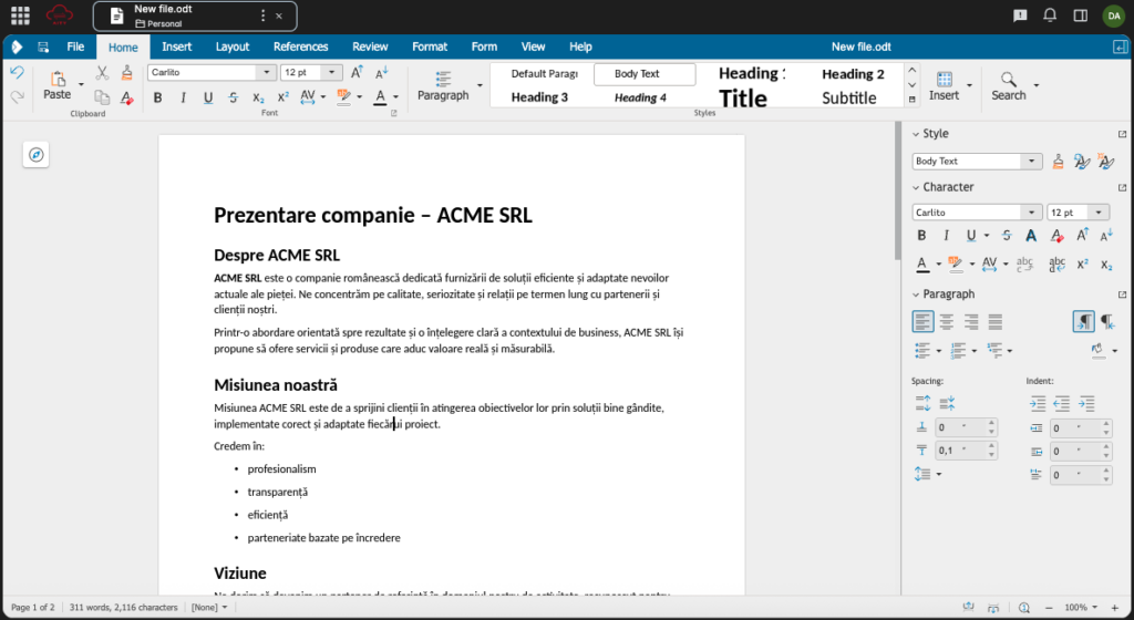 OpenDocument îți oferă un editor de texte online, familiar și intuitiv, ca să lucrezi fără instalări, direct din browser. Similaritatea cu Word face OpenDocument un beneficiu foarte important pentru echipele obișnuite cu suita Microsoft, dar care își doresc siguranță sporită.