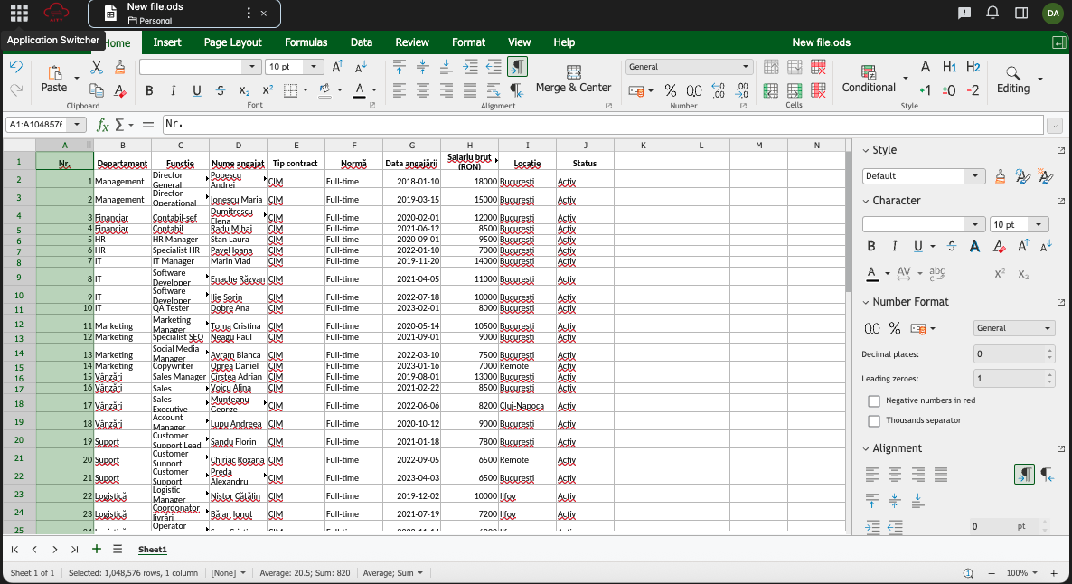 OpenSpreadsheet îți pune la dispoziție un instrument robust de foi de calcul, asemănător cu Excel sau Google Sheets, integrat direct în AITY Workspace.