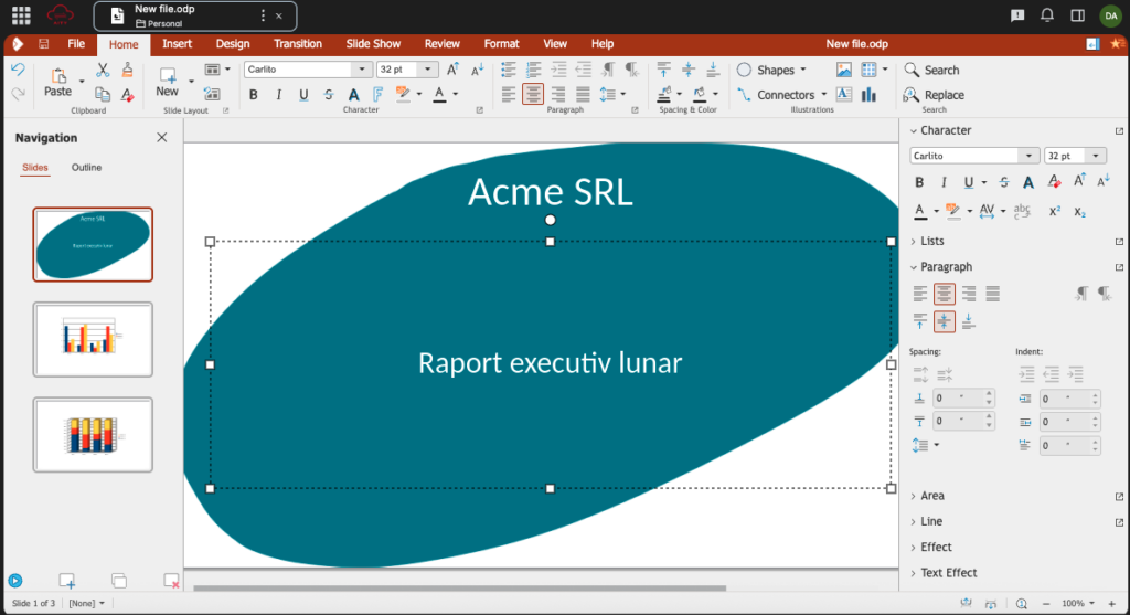 Creează slide-uri captivante cu text, imagini, grafice și elemente multimedia, toate fără bătăi de cap. Colaborarea este și aici un element-cheie: colegii pot revizui și comenta prezentarea în timp real, indiferent dacă lucrează de la birou sau de acasă.